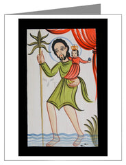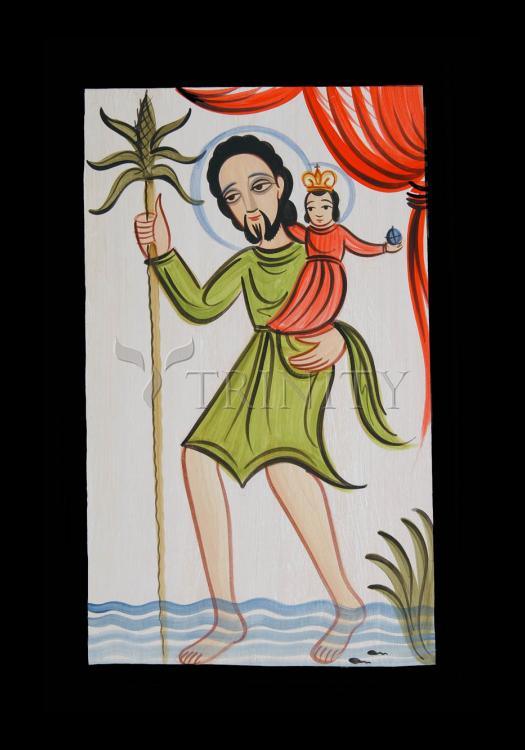 The one-time Catholic patron saint of travelers, Saint Christopher -- whose name means "Christ carrier" -- is not mentioned in the Bible. While there may have been a 3rd century Greek martyr named Christopher, the story told of him is now generally acknowledged to be a 12th century addendum to the Christian canon. Christopher is typically depicted as a tall, middle-aged, bearded man with a staff who wades across a river carrying the Christ child on his shoulders.