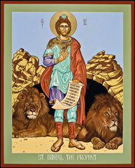 St. Daniel in the lions’ den is one of the best known stories from the Old Testament Book of Daniel, dating from the 6th century B.C. After the people of Judah were taken captive by King Nebuchadnezzar, Daniel and 3 others were placed into service of his court. Daniel excelled as a visionary and prophet. King Darius’ reign followed, and though he loved Daniel, was tricked into an edict that no one but himself in the kingdom was to pray for 30 days.