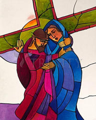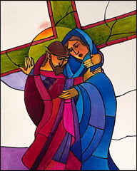 Jesus' path takes him to a powerful source of his strength to continue. All his life, his mother had taught him the meaning of the words, "Behold, the handmaid of the Lord." Now they look into each other's eyes. How pierced-through her heart must be! How pained he must be to see her tears! Now, her grace-filled smile blesses his mission and stirs his heart to its depth. Love and trust in God bind them together.